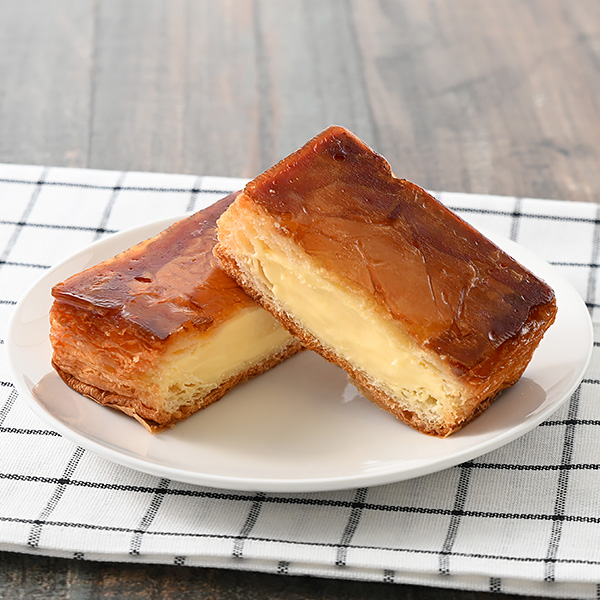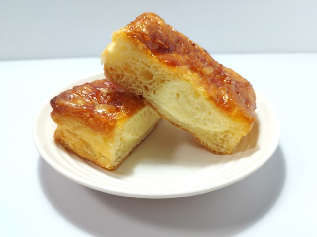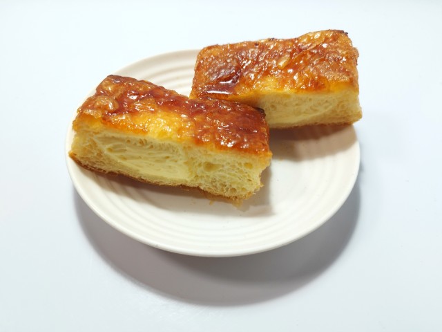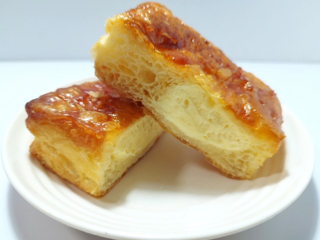 カスタードホイップが入ったクイニーアマンです。商品名に惹かれて買ってみた商品で、個人的には楽しみにしていた新商品の一つでもあります。そんなクレームブリュレ風クイニーアマンですが、表面のブリュレ風の飴がけはザクザクとした食感と香ばしい味わいで、ハマってしまう美味しさです。生地はしっとりとした食感と歯切れの良さで、飴がけとの相性も良いです。中にはカスタードホイップが入っていて、ふんわりとした食感とたまごの風味で、美味しいのひと言です。クイニーアマンの食感を楽しみつつ、クリームブリュレの味も楽しめるといった感じで、かなりお得な気分になれる菓子パンだと思います。大きさは普通の菓子パンサイズで、おやつや小腹が空いた時にピッタリです。ぜひクレームブリュレ風クイニーアマンを食べてみてください。