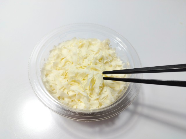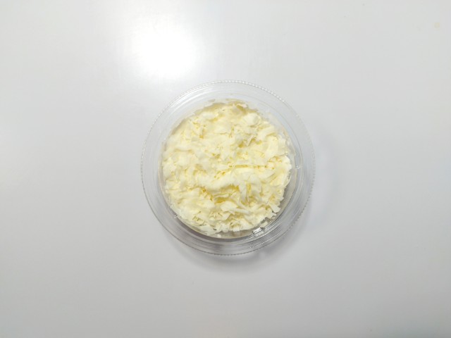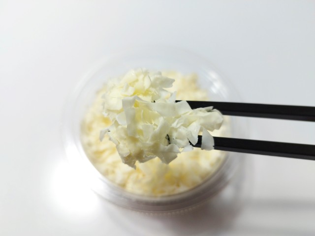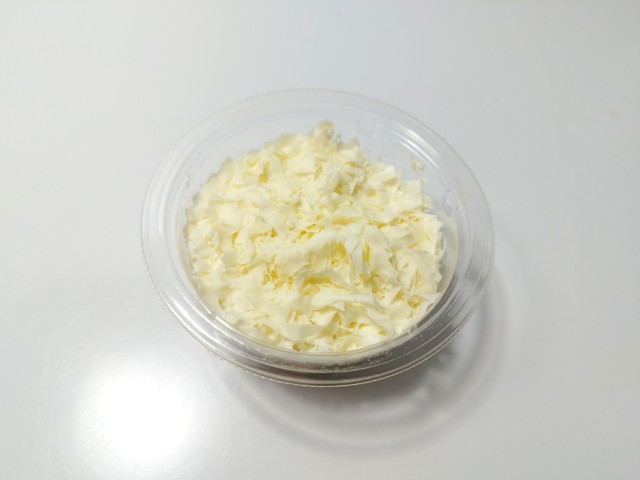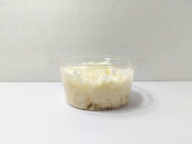パルメザンチーズがかかったチーズポテトサラダです。チーズ好きのためという商品名に惹かれて買ってみました。そんなチーズ好きのための白いポテトサラダですが、トッピングのパルメザンチーズはチーズのコクととけるような食感で、美味しいのひと言です。チーズポテトサラダはじゃがいもの味わいとチーズの風味、マヨネーズのほのかな酸味があって、パルメザンチーズともよく合います。このままでも十分に美味しいですが、味変として醤油を少したらすと醤油の風味が加わって、また違った味わいを楽しめます。カップデリシリーズなので内容量は多くはありませんが、おつまみやおかずをもう一品追加したい時にピッタリの商品です。ぜひチーズ好きのための白いポテトサラダを食べてみてください。