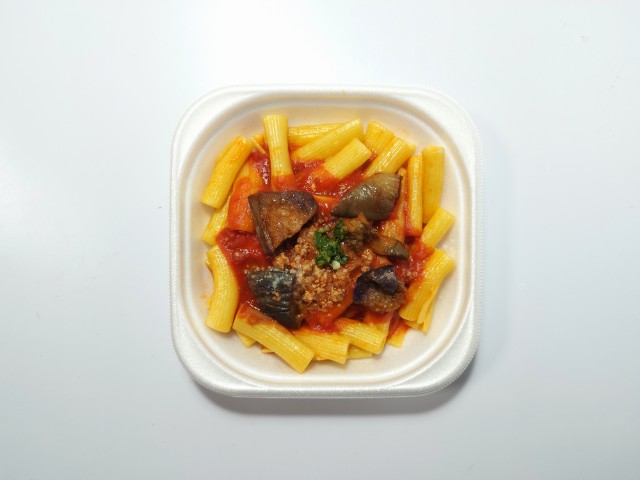 ショートパスタのリガトーニを使ったトマトソースパスタです。以前にナスと挽肉のピリ辛トマトソースパスタ(2025年6月18日発売)がありましたが、今回はショートパスタになっています。そんなトマトソースパスタですが、ソースはトマトの酸味と唐辛子のピリッとした辛味、にんにくの風味があって、ハマってしまう美味しさです。リガトーニはもちもちとした食感と小麦の風味があって、ソースもよく絡みます。トッピングのナスは、ジュワっとあふれる旨味ととろけるような食感、挽肉は肉の旨味とジューシーな味わいで、最後のひと口まで飽きることなく食べられます。内容量は1食分にちょうどよく、お腹も満たされます。ぜひリガトーニ使用のナスと挽肉のピリ辛トマトを食べてみてください。