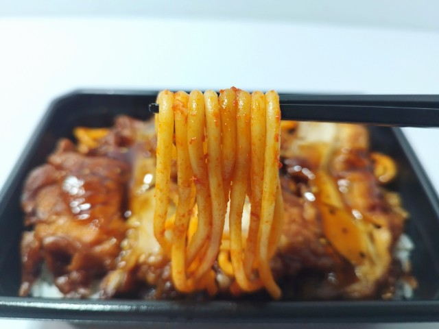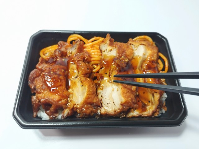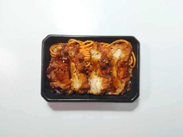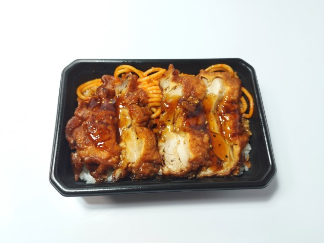 鶏唐揚スパゲティがのったお弁当です。おかズドン!デミソースチキンカツ弁当(2025年9月9日発売)おかズドン!タルタル鶏唐揚弁当(2025年9月9日発売)など、おかズドン!シリーズも色々なものが発売されていますが、今回は甘辛ダレ鶏唐揚になっています。そんな甘辛ダレ鶏唐揚弁当ですが、鶏もも唐揚鶏の旨味しっとりと柔らかい肉質ジューシーな脂で、ご飯が進む一品になっています。ポイントは上にかかっている甘辛ダレで、醤油の風味甘辛いタレの味わい胡椒のピリッとした辛味があって、鶏唐揚の美味しさをさらに引き立てています。他にもスパゲティが入っていて、箸休めにピッタリです。内容量は1食分にちょうどよく、お腹も満たされます。ぜひおかズドン!甘辛ダレ鶏唐揚弁当を食べてみてください。