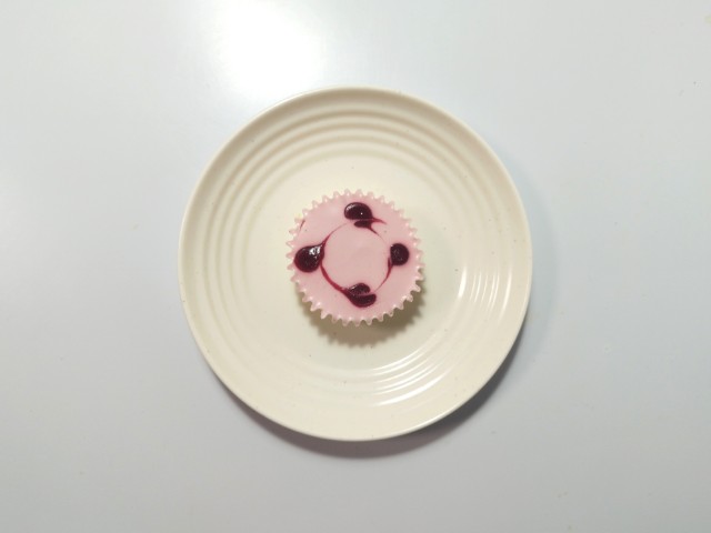 苺レアチーズムースの上に苺ソースがのっています。
