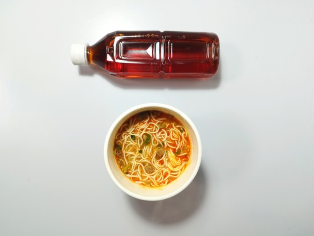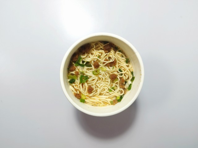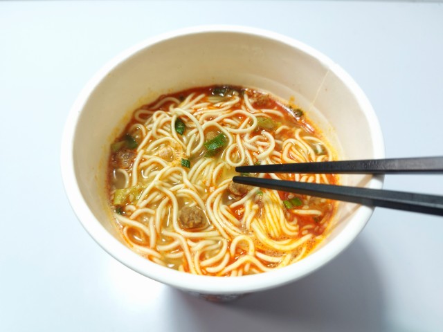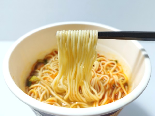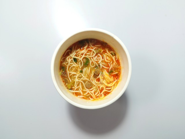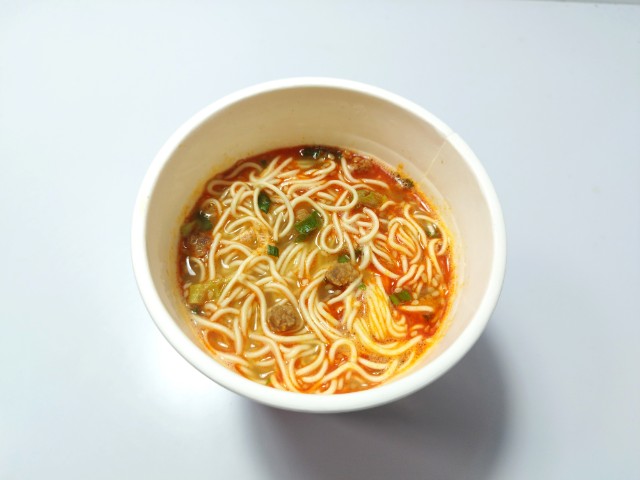 極細麺で食べる担々麺です。極細麺を使った麻辣担々麺という事で、その味が気になって買ってみました。そんな麻辣担々麺ですが、スープはごまの風味と唐辛子の辛味、花椒の香りがあって、ハマってしまう美味しさです。極細麺はプツッとした食感と歯切れの良さで、スープとの絡みも抜群です。具材には味付豚肉、ごま、ねぎが入っていて、それぞれの味や食感を楽しめます。内容量は普通のカップ麺サイズで、小腹が空いた時やおにぎりやパンと合わせて1食分にするのにもオススメです。ぜひ極細麺で味わう麻辣担々麺を食べてみてください。