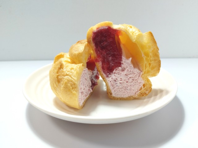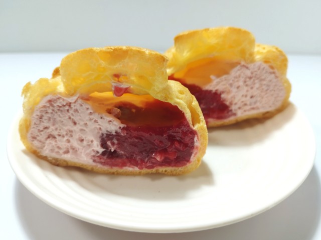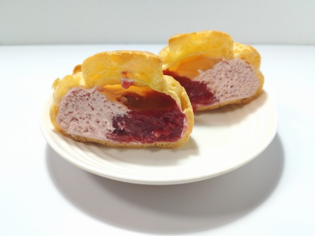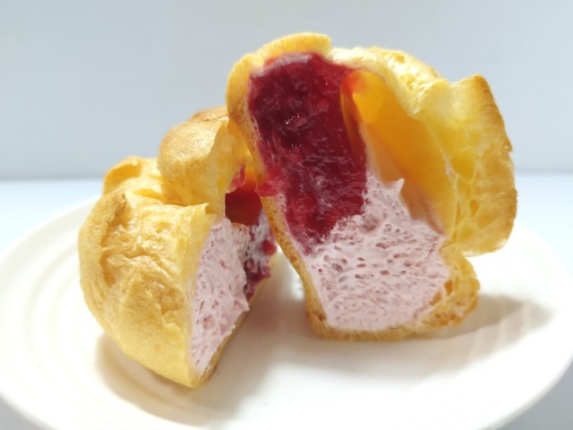 いちごソースといちごホイップが入ったシュークリームです。見つけた瞬間に手に取ってしまった商品で、個人的には楽しみにしていた新商品の一つでもあります。そんないちごのダブルシュークリームですが、シュー生地はふわっとした食感と歯切れの良さで、安定の美味しさです。中に使われているとろりとした食感のいちごソースはいちごの酸味と果肉の食感、なめらかな食感のいちごホイップはいちごの甘味とミルクの風味で、シュー生地とのバランスも良いです。大きさは普通のシュークリームサイズで、おやつや食後のデザートにピッタリです。ぜひいちごのダブルシュークリームを食べてみてください。