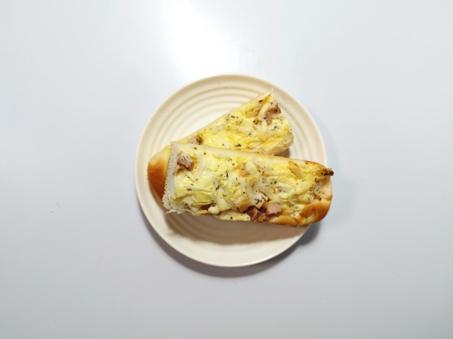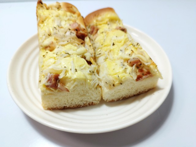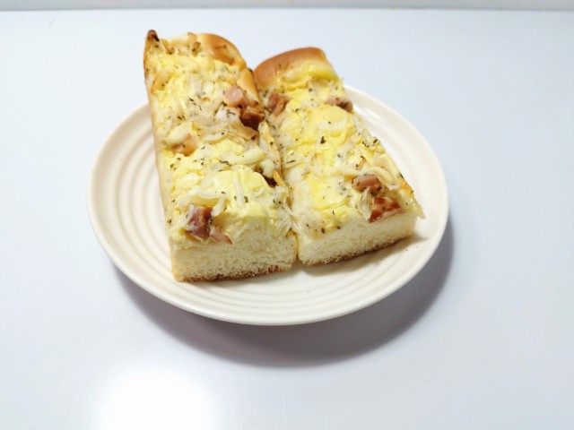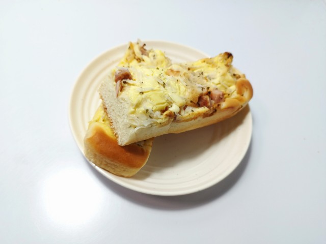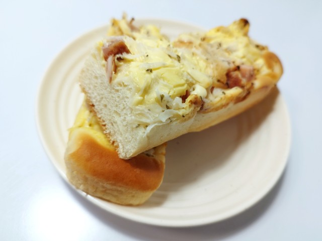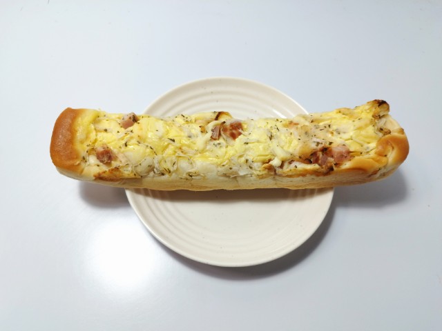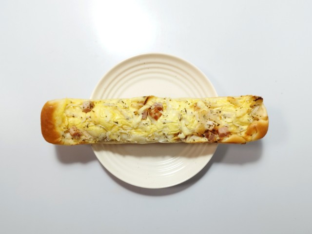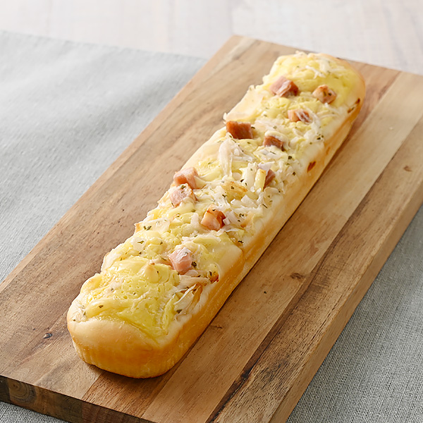チーズ・オニオン・ダイスベーコン・マヨをトッピングした、食べやすいスティック形状の惣菜パンです。