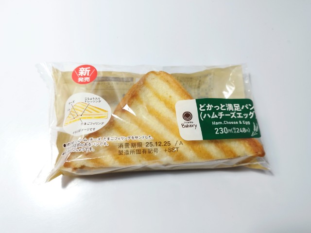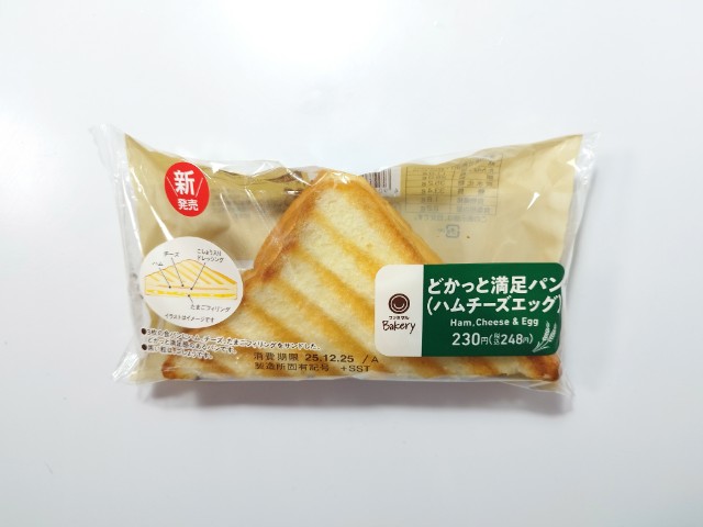 ハムとチーズ、たまごサラダを挟んだ惣菜パンです。どかっと満足パン(ミート&チーズ)(2025年12月9日発売)やどかっと満足パン(メンチカツ)(2025年11月11日発売)など色々とあるどかっと満足パンシリーズですが、今回はハムとチーズ、たまごサラダを使った商品になっています。そんなどかっと満足パンですが、生地は生地はしっとりとした食感と小麦の風味で、安定の美味しさです。食パンの間には定番人気の具材でもあるハムとチーズ、たまごサラダが挟んであって、それぞれの味や食感を楽しむ事が出来ます。大きさは6枚切の食パン1.5枚分くらいで、小腹が空いた時や主食にあと一品追加したい時にピッタリです。ぜひどかっと満足パンを食べてみてください。