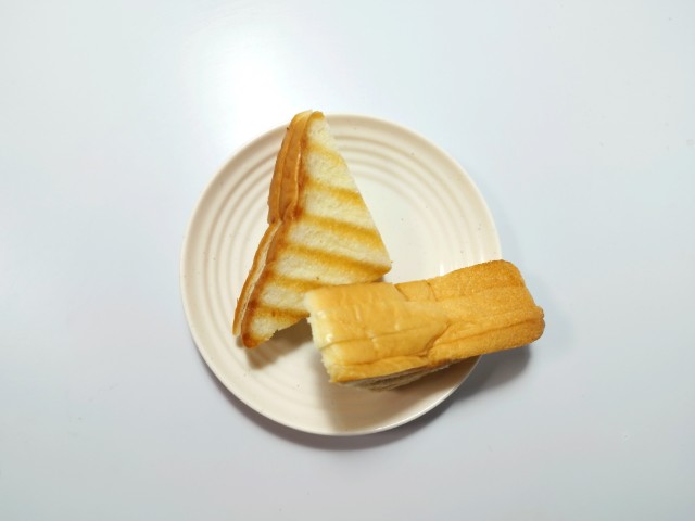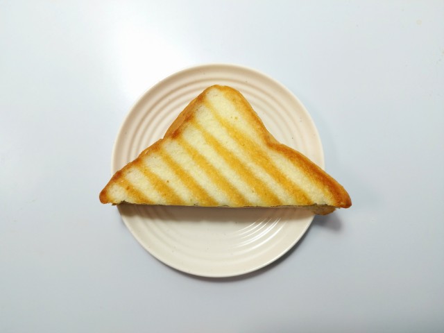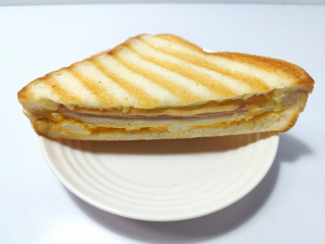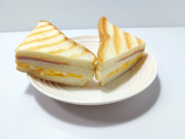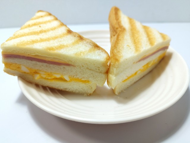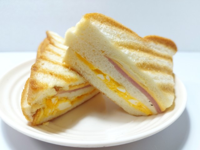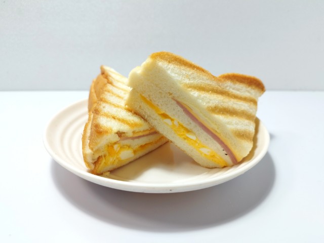 3枚の食パンにハム・チーズ・たまごサラダをサンドし、ハーフカットして焼き上げた、ボリュームのある惣菜パンです。
