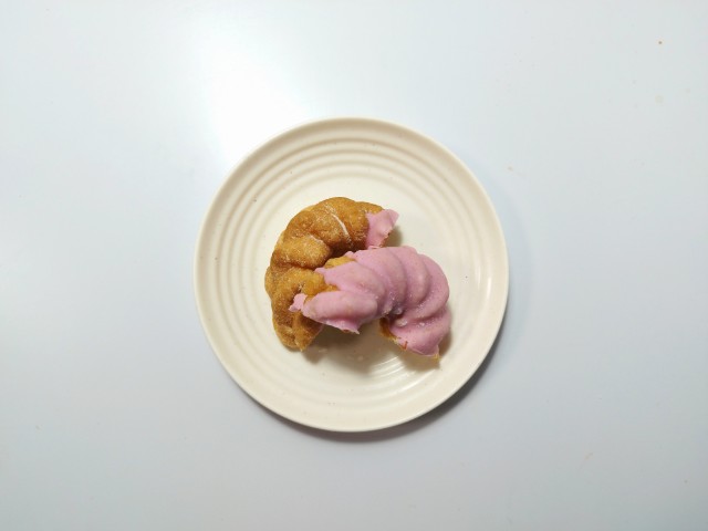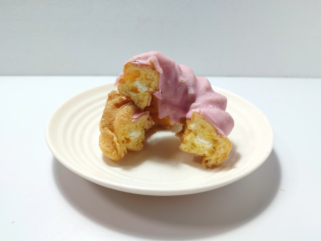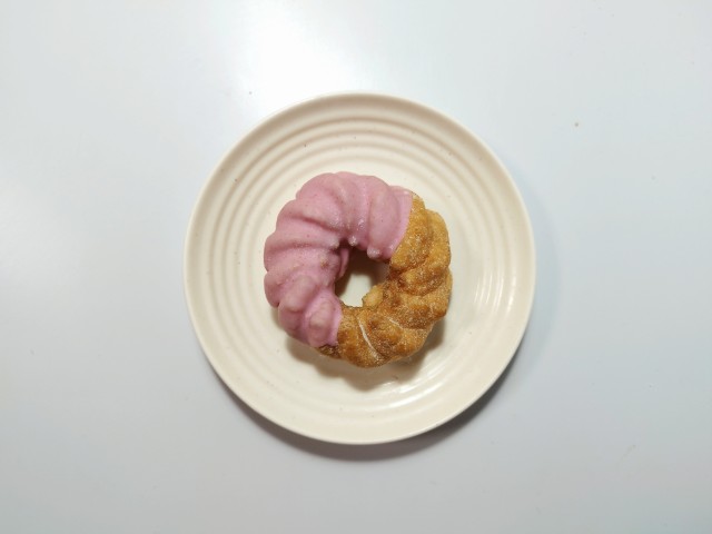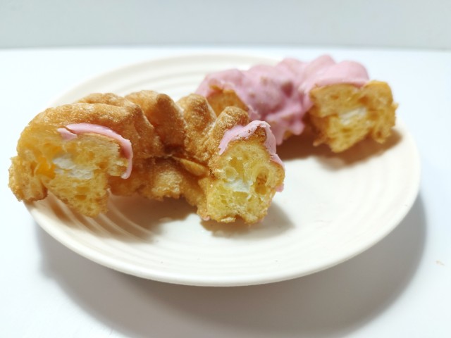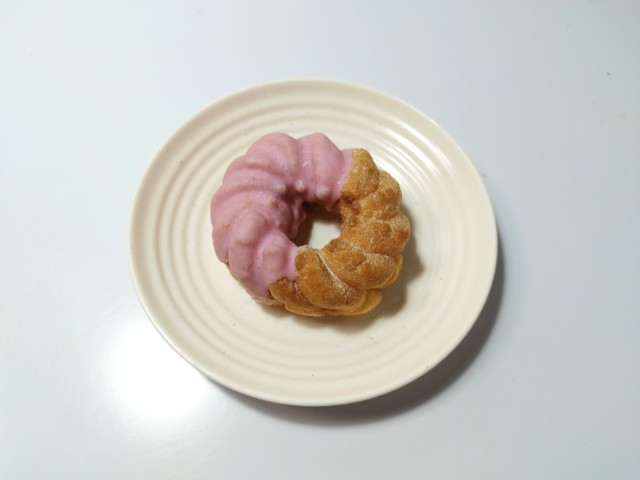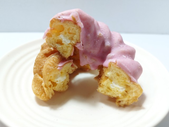 定番のフレンチクルーラーにホイップをサンドして、イチゴのコーチングを掛けたドーナツです。