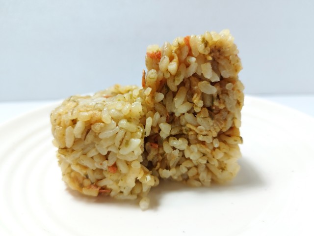 天かすや天つゆ、あおさ、小海老を混ぜ込んだおにぎりです。混ぜ込まれている食材の時点で、もう美味しいイメージしかなく、見つけた瞬間に買ってしまいました。そんな天かす小海老おにぎりですが、ご飯は醤油たれの旨味と天かすの味わい、あおさの風味があって、ハマってしまう美味しさです。一緒に混ぜ込まれている小海老は海老の風味と香ばしさがあって、味や食感のアクセントになっています。見た目よりもあっさりと食べられるおにぎりで、他の商品とも合わせやすいと思います。大きさは普通のおにぎりサイズで、小腹が空いた時や主食にあと一品追加したい時にピッタリです。ぜひ天かす小海老おにぎりを食べてみてください。