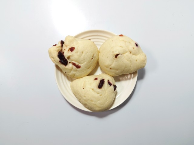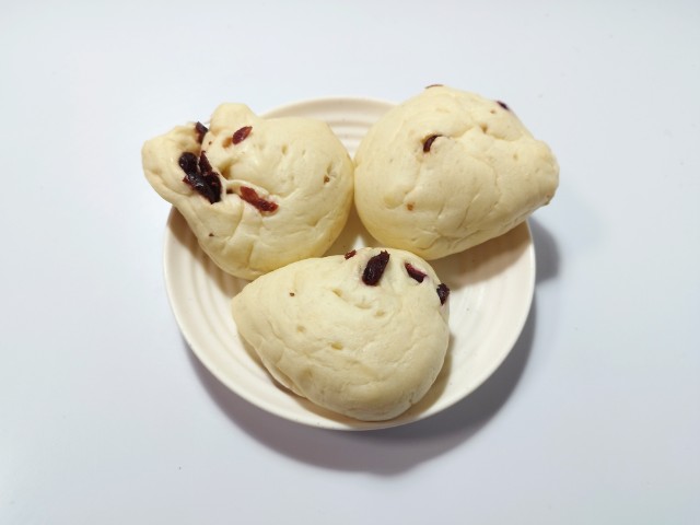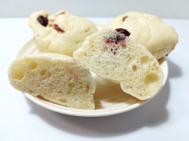 クランベリーを使ったロールパンです。クランベリーロールの言葉に惹かれて買ってみました。そんなクランベリーロールですが、生地はもっちりとした食感と小麦の風味で、安定の美味しさです。生地には形の違った2種類のクランベリーが練り込まれていて。クランベリーの酸味とほどよい甘味で、味や食感のアクセントになっています。3個入ですが、1個はふた口サイズくらいなので、一人でも普通に食べ切れます。もちろんシェアするにもピッタリです。ぜひクランベリーロールを食べてみてください。