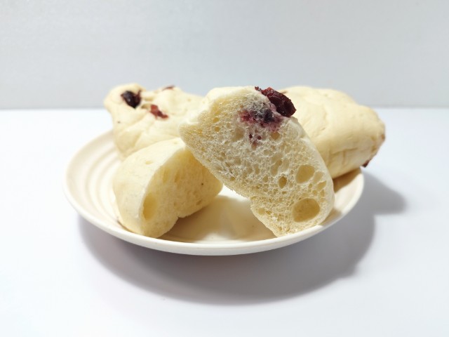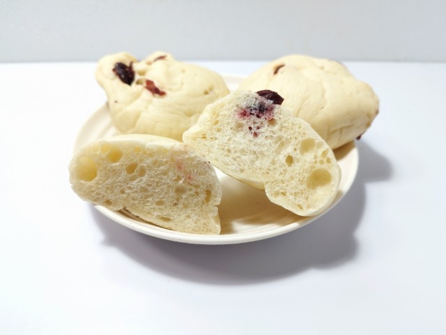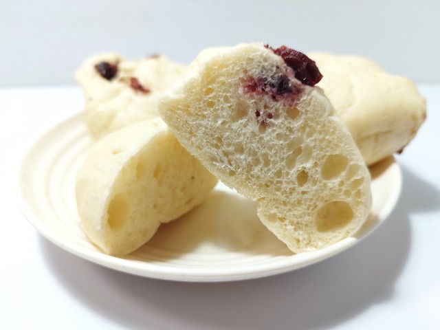 ジューシーなホール状の砂糖漬けクランベリーと、カットした砂糖漬けクランベリーの2種類をパン生地に練り込み、しっとりもっちり食感に焼き上げました。