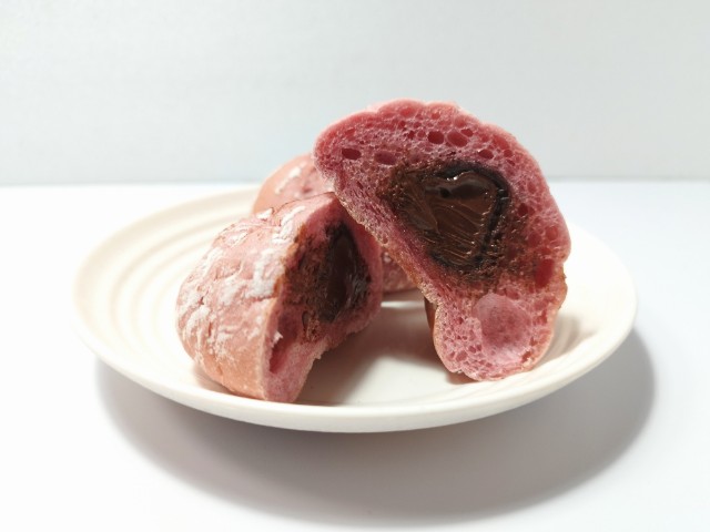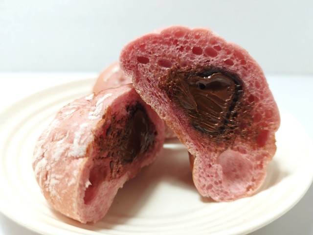 苺シュガーチップを練り込んだ苺風味の生地に濃厚なチョコクリームを注入しました。