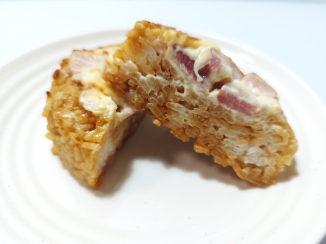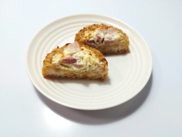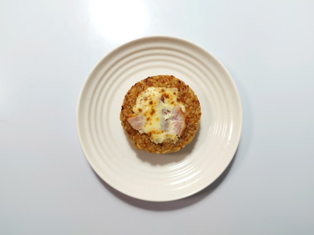 ベーコン,チーズ,玉葱のマヨネーズ和えをご飯に乗せて焼き上げたおむすびです。
