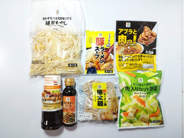 極太麺を使った焼きそばです。昨年10月に発売されてからずっと食べてみたいと思っていた商品で、今回やっと作る事が出来ました。そんな焼きそばですが、ソースの旨味背脂のコクにんにくの味わいがあって、美味しいのひと言です。極太麺もちもちとした食感小麦の風味で、ソースともよく合います。今回はウスターソース大さじ2オイスターソース小さじ1で味付けしています。そして、一番重要なのが豚ラーメンスープで、お湯に溶かさずに原液のまま大さじ1~2くらい加える事で、一気に味が変わります。一応、豚ラーメンスープを先に加えて、その後にウスターソースオイスターソースで味の調整をしているので、分量は多少誤差があるかもしれません。ちなみにをしかなくても豚ラーメンスープラードが入っているので、何ら問題ありません。また、極太麺は炒めると硬くなりそうだったので、パッケージの裏に書いてあるゆで時間最長11分やわらかめで仕上げてあります。トッピングにはもやし背脂煮豚をのせています。今回極太麺以外として7プレミアム 中華蕎麦とみ田監修 豚ラーメンスープ 148円(税込159.84円)7プレミアム ウスターソース 300ML 168円(税込181.44円)7プレミアム オイスターソース 188円(税込203.04円)7プレミアム 肉入りカット野菜 138円(税込149.04円)7プレミアム緑豆もやし 50円(税込54円)7プレミアム アブラと肉っ! 268円(税込289.44円)を使っていますが、見ての通り全部は使い切れていないので、1食あたりの金額は算出していません。もちろん、もっと安い食材良い材料スーパー専門店などで見つければあると思いますが、あくまでセブンイレブンの食材のみで作っているので、見た目内容はご理解いただけると助かります。余談ですが、豚ラーメンスープで味付けした段階で味見をしてみましたが、焼ラーメンでもいけるレベルの美味しさでした。内容量は1食分にちょうどよく、お腹も満たされます。ぜひ極太麺を食べてみてください。