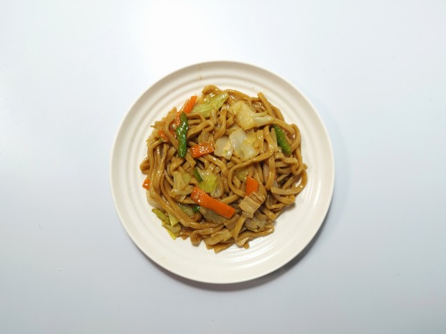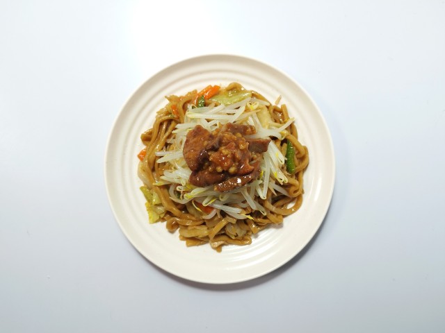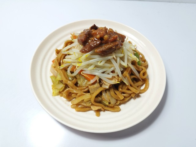 肉入りカット野菜を加えて、豚ラーメンスープウスターソースオイスターソースで炒めました。