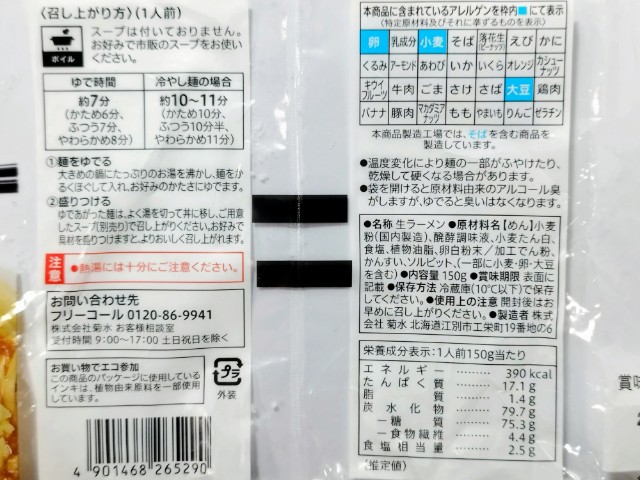熱量:390kcal、たんぱく質:17.1g、脂質:1.4g、炭水化物:79.7g(糖質:75.3g、食物繊維:4.4g)、食塩相当量:2.5g