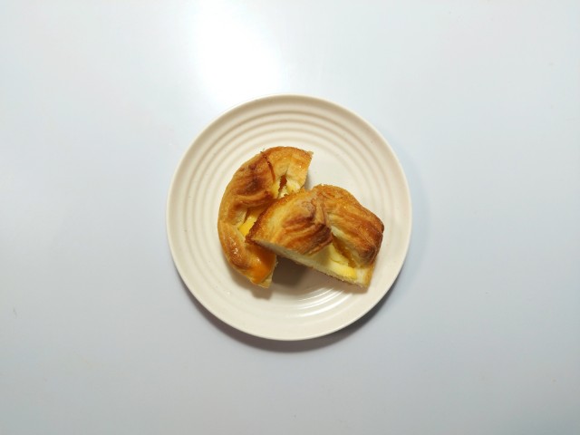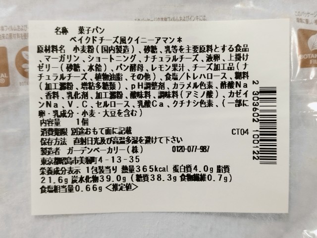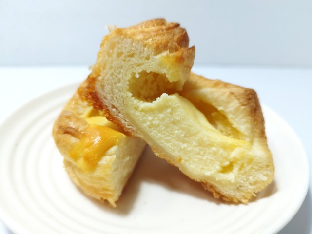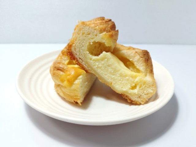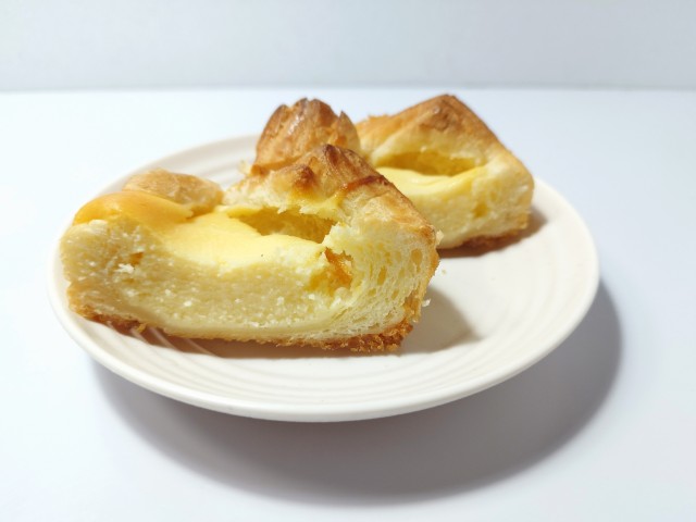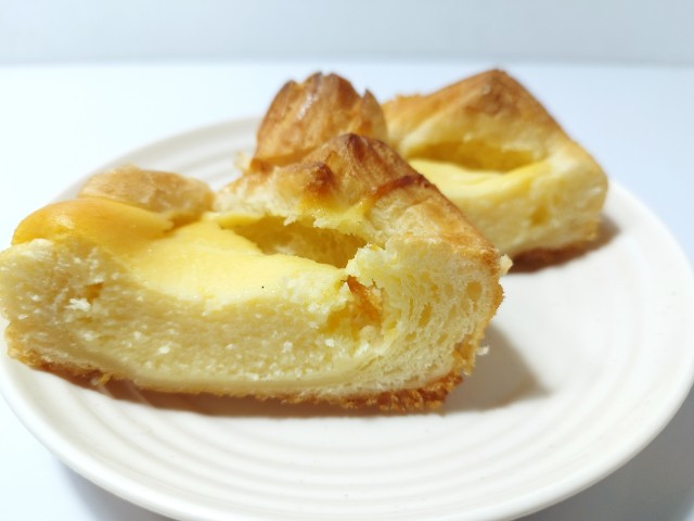 ベイクドチーズ風のクイニーアマンです。ベイクドチーズケーキとクイニーアマンの組み合わせの時点で美味しいイメージしかなく、見つけた瞬間に手に取ってしまいました。そんなベイクドチーズ風クイニーアマンですが、生地はしっとりとした食感とほのかな塩味で、安定の美味しさです。中のチーズケーキ生地はねっとりとした食感とチーズの濃厚な味わいで、生地とのバランスも良いです。底面には飴がけがされていて、カリカリとした食感としっかりとした甘味で、味や食感のアクセントになっています。ベイクドチーズケーキとクイニーアマンの良い部分が上手く表現されているといった感じの菓子パンで、最後のひと口まで美味しく食べられます。大きさは普通の菓子パンサイズで、おやつや小腹が空いた時にピッタリです。ぜひベイクドチーズ風クイニーアマンを食べてみてください。