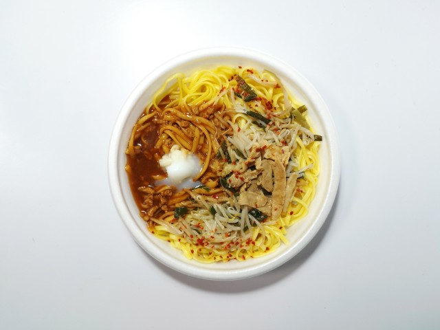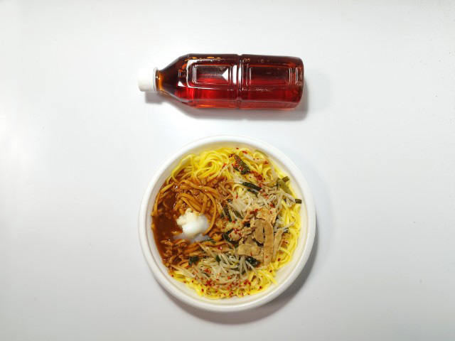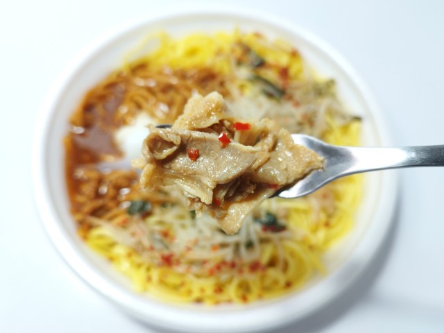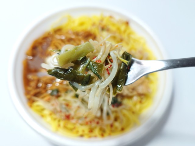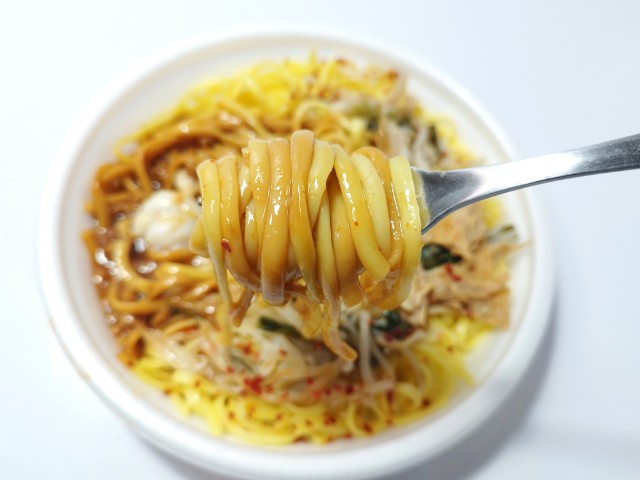 醤油あんかけパスタです。商品名やその味が気になって買ってみました。そんなスタミナ醤油パスタですが、味付けである醤油あんはにんにくの風味と醤油の味わい、ピリッとした辛味があって、クセになる美味しさです。リングイネのパスタはモチモチとした食感と小麦の風味で、濃厚な醤油あんにも負けていません。具材には豚肉やもやし、にら、背脂、にんにくなどがのっていて、それぞれの味や食感を楽しめます。一応、パスタなのでフォークで食べてはいますが、味付けとしては箸で食べたくなるくらいのガッツリとした味わいで、食べた後に人に会うなら気にした方が良いレベルのにんにくが効いています。内容量は1食分にちょうどよく、お腹も満たされます。ぜひスタミナ醤油パスタを食べてみてください。