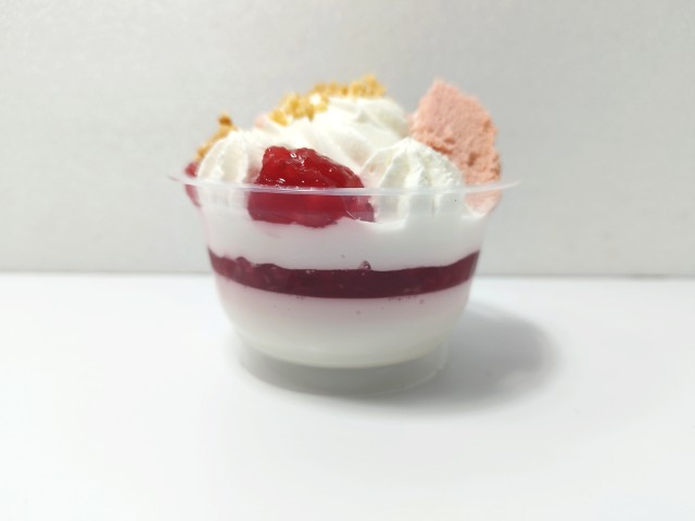いちごとミルクを使ったプリンパフェです。見た目の鮮やかさに惹かれて買ってみました。そんなプリンパフェですが、上からビスケット、いちご練乳ソース、いちごチーズケーキ、ミルククリームとなっていて、ビスケットはほろほろとした食感と香ばしい味わい、いちご練乳ソースはいちごの風味と練乳の甘味、いちごチーズケーキはチーズの風味といちごの香り、ミルククリームはなめらかな食感とミルクの風味で、それぞれの味や食感を楽しむ事が出来ます。その下はスポンジ、いちごクリーム、果肉入りいちごソース、ミルクプリンとなっていて、スポンジはしっとりとした食感とほのかな甘味、いちごクリームはいちごミルクの味わい、果肉入りいちごソースはとろりとした食感といちごの酸味、ミルクプリンはプルンとした食感とミルクの味わいで、最後のひと口まで飽きることなく食べられます。いちごとミルクの組み合わせの良さもありますが、色々な具材がある事で味や食感を楽しめる満足度が高いスイーツになっていると思います。内容量は一人分にちょうどよく、おやつや食後のデザートにオススメです。ぜひいちごとミルクのプリンケーキパフェを食べてみてください。