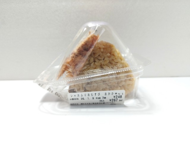 おかかをまぶして食べるおむすびです。シャカふりおむすび ベビースター明太チーズ(2026年1月6日発売)と同時発売された商品で、こちらはおかかになっています。そんなシャカふりおむすびですが、別添のをまぶして食べるおむすびで、説明によると容器のフタ側におかかを入れて、もう一度閉じた後によく振って食べるようです。ベビースター明太チーズが味と食感は良かったものの、ちょっと食べづらかった部分もあって、今回はかなり食べやすく感じてしまいました。そんなシャカふりおむすびですが、おかかの風味味わいがしっかりとあって、食べ出すと止まらなくなる美味しさです。中のおかか煮ほどよい塩味があって、味のアクセントになっています。ご飯にもおかかが混ぜ込まれているなど、おかかづくしといったおむすびですが、この商品の一番のポイントは別添のかつお節香り高さ風味の良さだと思います。このおむすびに限らず、封を切ったばかりのおかかおむすびのおかかとは全く異なる美味しさで、塩むすび焼おむすびにかけてもワンランク上のおむすびになると思います。大きさは普通のおむすびサイズで、小腹が空いた時主食にあと一品追加したい時にピッタリです。と、ここまで色々と言っておいてなんですが、今回の商品は一部店舗と限られてしまっているので、購入するのはちょっと厳しいかもしれません。ただ、一部店舗で販売として紹介していた商品が、翌々週の新商品としてほぼ全国で発売となったりしているので、この商品ももしかしたら同様に販売されるかもしれません。まだまだ、その地域のセブンイレブンでしか買えない商品はたくさんあって、皆さんの地域にもあると思います。今回の商品もこんな商品を売っているんだ的な感覚で見てもらって、高そうや美味しくなさそうといった見方や、ご自身の地域でしかない商品の比較などにしてもらえたら嬉しく思います。と言っているのに申し訳ないですが、締めの言葉は必要ですので最後に、ぜひおかかシャカふりおむすびを食べてみてください。