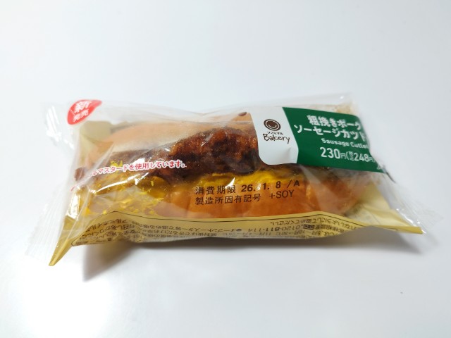 ソースで味付けした粗挽きポークソーセージカツとマスタードをサンドした惣菜パンです。