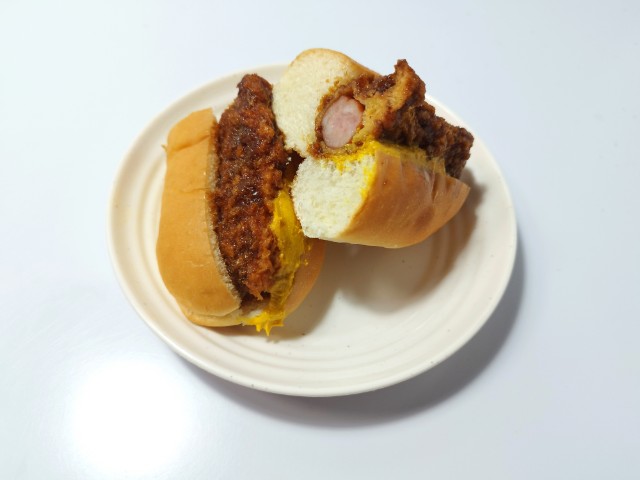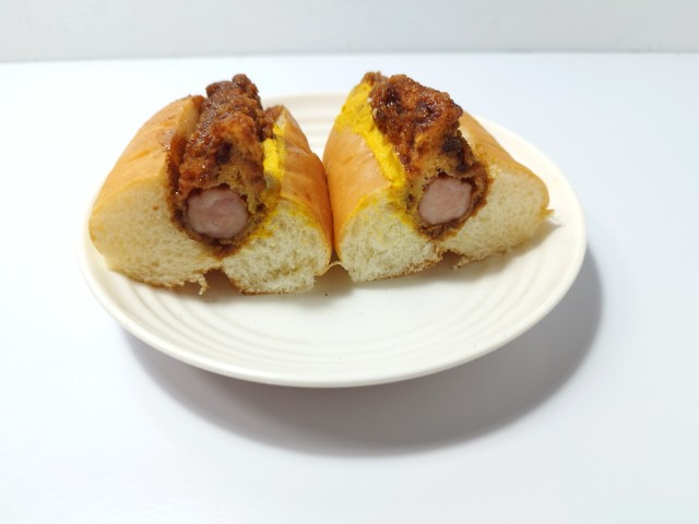 粗挽きポークソーセージカツとマスタードを挟んだ惣菜パンです。同様の商品として、以前に生コッペパン(ソーセージカツ)(2024年12月17日発売)がありましたが、こちらは生コッペパンではない惣菜パンになっています。そんな粗挽きポークソーセージカツドッグですが、生地はしっとりとした食感と歯切れの良さで、安定の美味しさです。粗挽きポークソーセージカツはソーセージのパリッとした食感と肉の旨味、衣に染みたソースの味わいで、パンともよく合います。ポイントはやはりマスタードで、マスタードの風味とほどよい辛味が、さらに食欲をかき立ててくれます。大きさは普通の惣菜パンくらいで、主食にあと一品追加したい時や小腹が空いた時にピッタリです。ぜひ粗挽きポークソーセージカツドッグを食べてみてください。