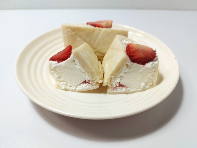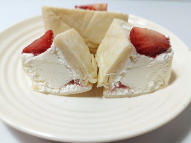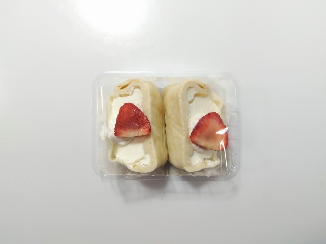 いちごがのったクレープです。ファミリーマートでは1月6日より「ファミマの白をまとったいちご狩り」を開催していて、今回の商品もその対象商品の一つになっています。そんないちごのクレープですが、生地はもちもちとした食感とたまごの風味で、ハマってしまう美味しさです。中にはホイップクリームとミルクムースが入っていて、ホイップクリームはふんわりとした食感とミルクの風味、ミルクムースはプルンとした食感とミルクのコクで、相性抜群の組み合わせになっています。トッピングのいちごや底にあるいちごソースが味や食感のアクセントになっていて、最後のひと口まで美味しく食べられます。2個入ですが、1個はふた口サイズくらいなので、一人でも普通に食べ切れます。ぜひもちっと食感いちごのクレープを食べてみてください。