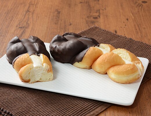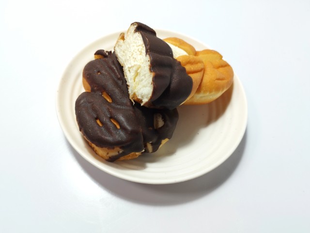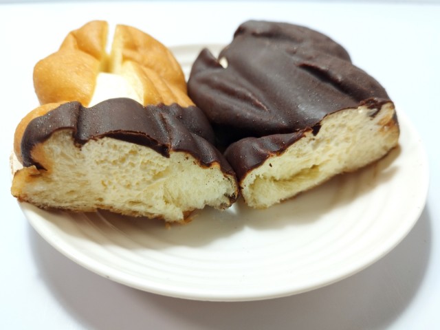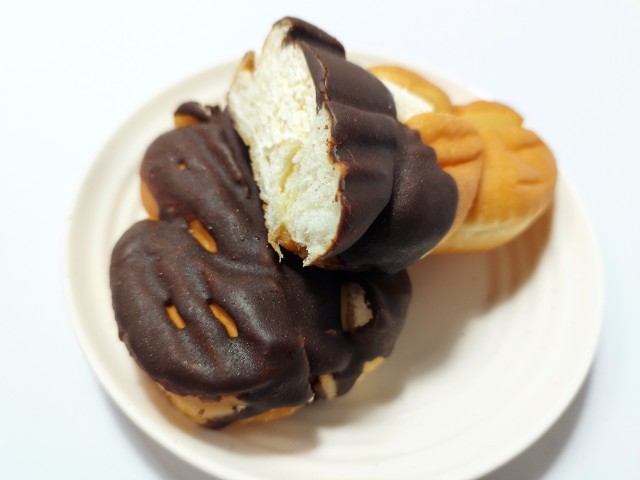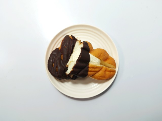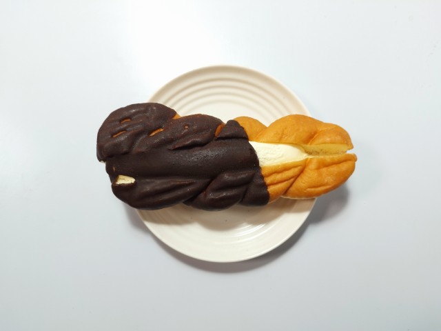 カスタードホイップを挟んだツイストドーナツです。シンプルながらその見た目に惹かれて買ってみました。そんなツイストドーナツですが、生地はしっとりとした食感とほのかな甘味があって、安定の美味しさです。生地に半分かかっているチョココーティングはチョコの甘味があって、味のアクセントになっています。中のカスタードホイップはなめらかな食感とミルクの味わい、たまごの風味があって、生地とのバランスも良いです。大きさは普通サイズの菓子パンで、おやつや小腹が空いた時にピッタリです。ぜひツイストドーナツを食べてみてください。