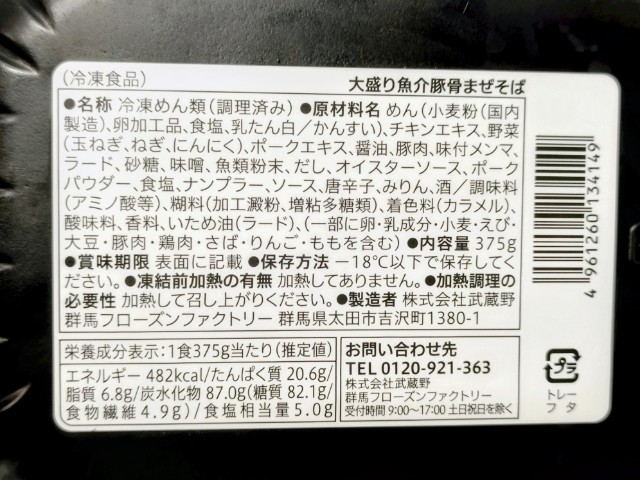 熱量:482kcal、たんぱく質:20.6g、脂質:6.8g、炭水化物:87.0g(糖質:82.1g、食物繊維:4.9g)、食塩相当量:5g