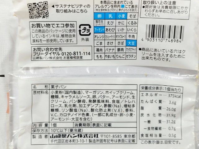 熱量:375kcal、たんぱく質:3.6g、脂質:26.0g、炭水化物:31.9g(糖質:31.2g、食物繊維:0.7g)、食塩相当量:0.5g