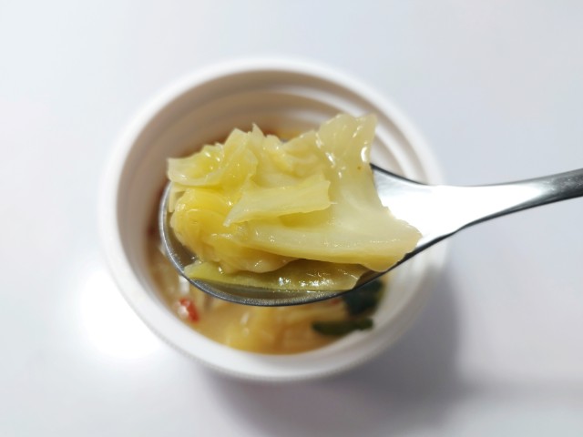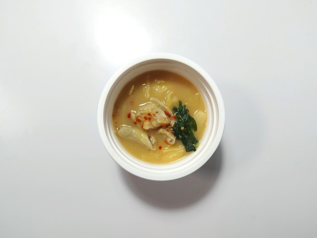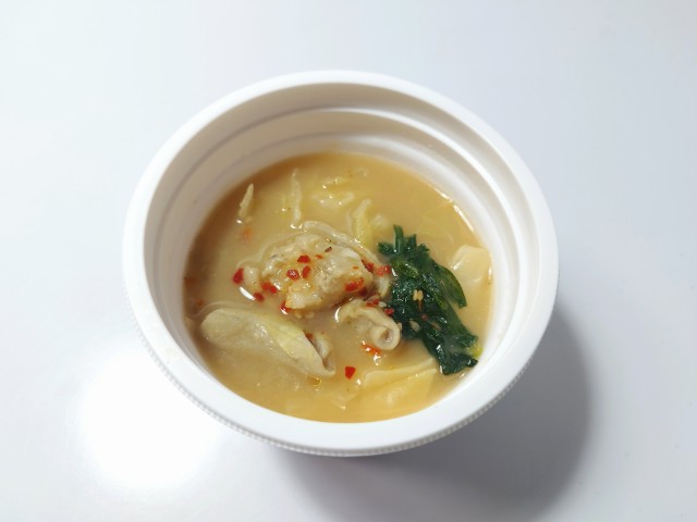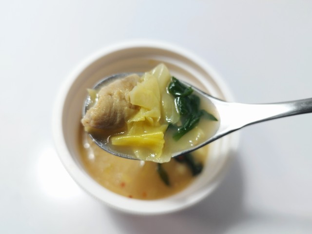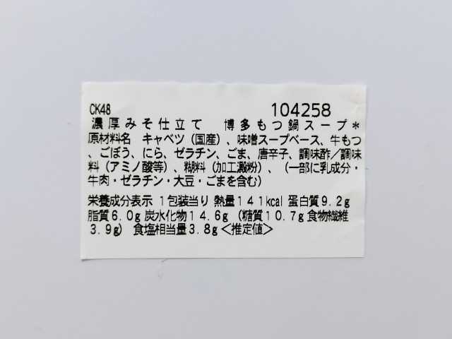 博多もつ鍋スープです。セブンイレブンでは1月20日から全国のご当地スープ(9種類)を味わえる「日本横断!ご当地スープ巡り」全3回に分けて開催していて、今回の商品もその対象商品の一つとなっています。ちなみに今回の商品は第3弾になっていて、第1弾(3種類)11月4日から順次発売第2弾(3種類)11月25日順次発売されました。そんな博多もつ鍋スープですが、味噌のコク野菜の旨味ほどよい甘味があって、間違いのない美味しさです。具材には牛もつを始め、キャベツごぼうにらなどが入っていて、それぞれの味や食感を楽しめます。特に牛もつプルンとした食感臭みもなく、美味しいのひと言です。内容量は一人分にちょうどよく、小腹が空いた時主食にあと一品追加したい時にピッタリです。ぜひ博多もつ鍋スープを食べてみてください。