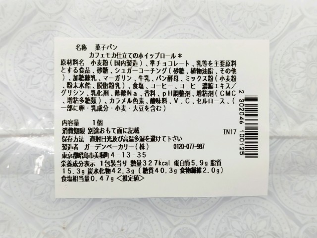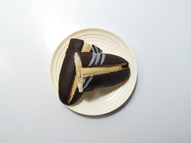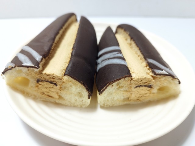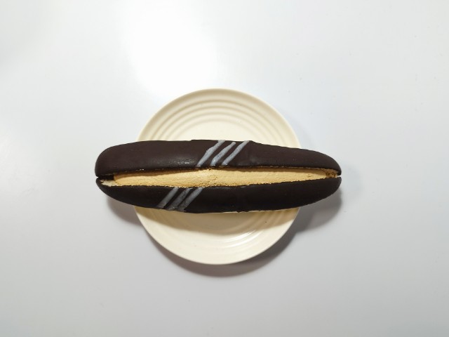 コーヒーホイップとチョコレートコーティングを組み合わせた菓子パンです。見つけた瞬間に手に取ってしまった商品で、個人的には楽しみにしていた新商品の一つでもあります。そんなカフェモカ仕立てのホイップロールですが、生地はふんわりとした食感と歯切れの良さがあって、安定の美味しさです。生地にはチョココーティングがかかっていて、パリっとはしていないものの、しっとりとした食感とチョコの甘味で、生地とのバランスも良いです。中のコーヒーホイップはコーヒーの風味とミルクの味わいがあって、しっかりとカフェモカ仕立てになっていると思います。大きさは普通の菓子パンサイズくらいで、おやつや小腹が空いた時にピッタリです。ぜひカフェモカ仕立てのホイップロールを食べてみてください。