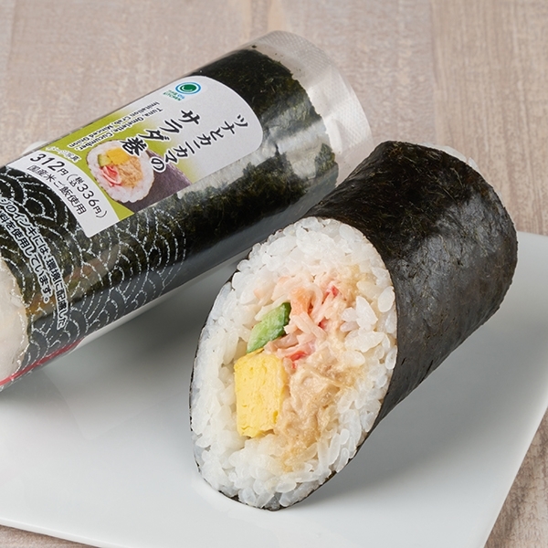 だし醤油入りのタレを使用したツナマヨネーズに、オニオン入りのかに風味かまぼこマヨネーズあえ、きゅうり、たまご焼を合わせたサラダ巻です。