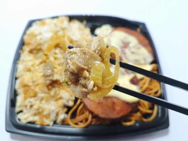 にんにく醤油だれがかかった御飯に、ソーセージステーキと生姜焼きを組み合わせた、満足感のあるお弁当です。