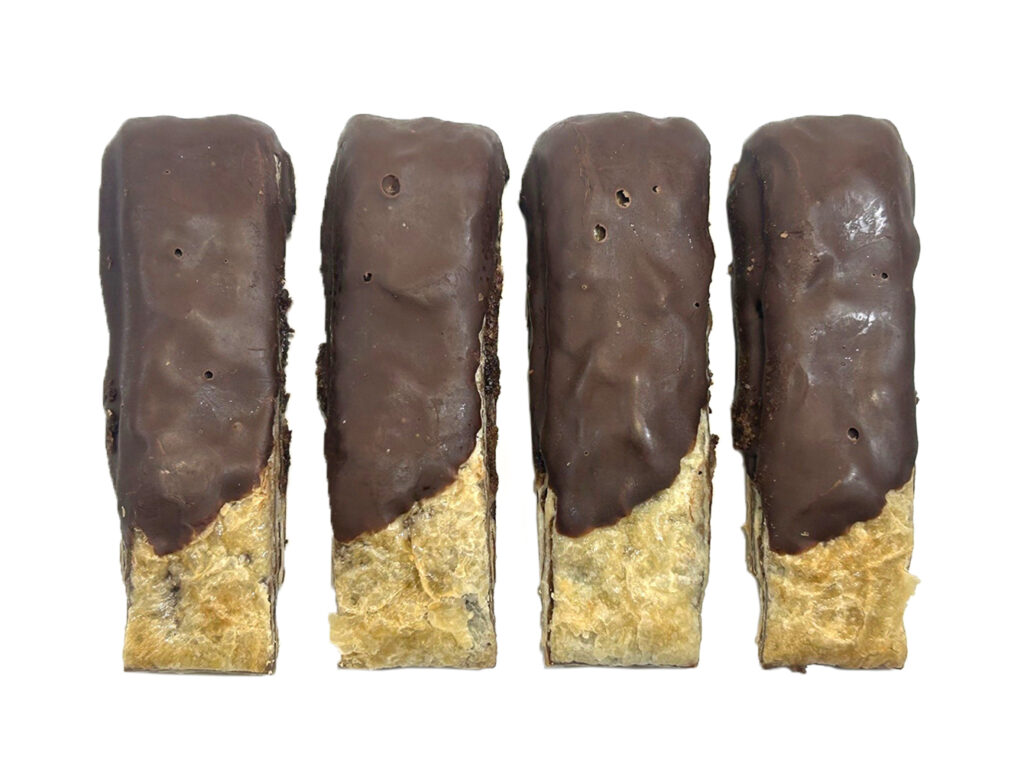 デニッシュ生地でチョコブラウニー生地を包んで焼き上げ、チョコレートを掛けました。食べやすいスティック形状の4本入です。