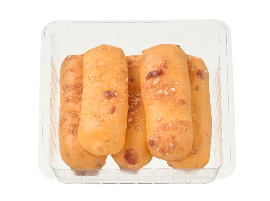 ピザソースとチーズを練りこんでピザ味に焼き上げたもちもち食感の生地。スティック形状5本入りで一人でも複数人でも様々な食シーンに対応。