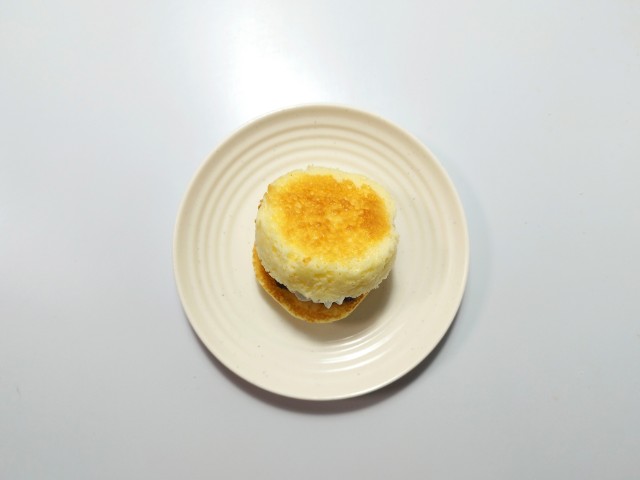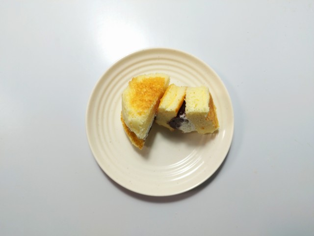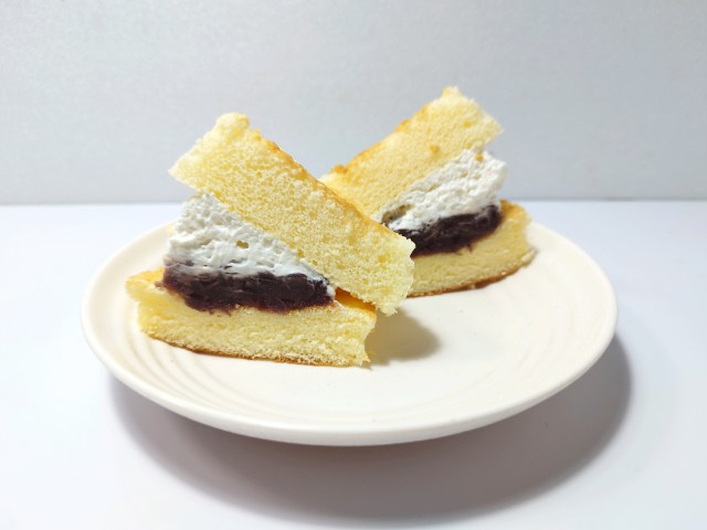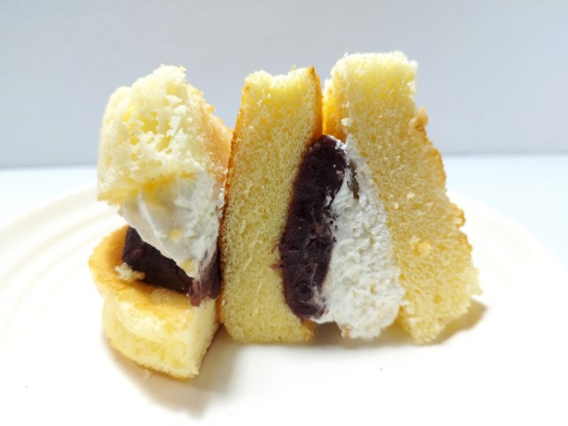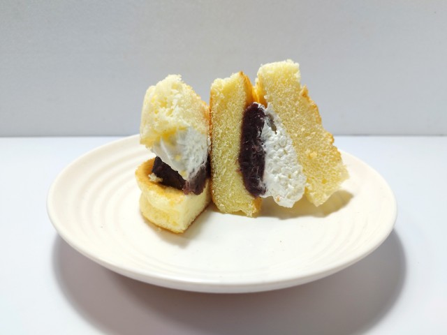 つぶあんとみるくホイップクリームを挟んだどら焼きです。雲どらの言葉に惹かれて買ってしまった商品で、個人的には楽しみにしていた新商品の一つでもあります。そんな雲どらですが、生地はふんわりとした食感とはちみつの風味があって、これだけでも美味しく食べ進められます。つぶあんは小豆の風味とほどよい甘味、みるくホイップクリームはなめらかな食感とミルクのコクで、相性抜群の組み合わせになっています。厚焼きのふわふわ生地がシフォンケーキのような感じなので、従来のどら焼きのイメージではありませんが、これはこれで美味しいスイーツになっていると思います。大きさは手のひらサイズくらいで、おやつや食後のデザートにピッタリです。ぜひ雲どらを食べてみてください。