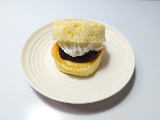 厚焼きのふわふわとしたどら焼生地で、つぶあんとみるくホイップクリームを挟んだ商品です。