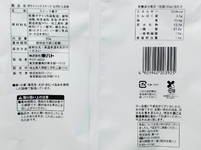 なげわのしお味です。ローソンでは1月27日より「盛りすぎチャレンジ」を開催していて、今回の商品も対象商品の一つになっています。内容としては内容量がお値段そのまま50%増量(従来品との比較)になっているらしいです。そんななげわですが、ポテトの味わいとほどよい塩味、サクッとした食感で、食べ出すと止まらなくなる美味しさです。ただ、今回は増量されている事もあって、途中で塩味がきつくなってきます。一人なら数回に分けて食べるか、数名でシェアするのがオススメです。ぜひ50%増量のなげわを食べてみてください。