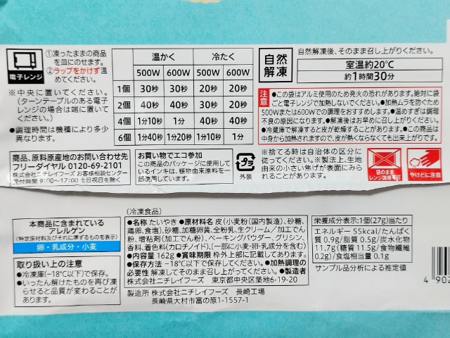6個入の白いミニたい焼きです。冷凍食品のミニたい焼きで、見つけた瞬間に気になって手に取ってしまいました。ちなみに上記の商品詳細にもありますが、加熱時間によってたい焼きの温かさを決められるので、自分好みの味わいを楽しむ事が出来ます。撮影では6個を1分10秒で温めてみました。そんな白いミニたい焼きですが、生地はもちもちとした食感とほのかな甘味で、クセになってしまう美味しさです。中にはカスタードクリームが入っていて、クリームのなめらかな味わいとたまごの風味があって、生地とのバランスも良いです。味や食感としてはほぼ通年販売の商品でもある7プレミアム しろもちたい焼き カスタードクリーム(2025年7月31日発売)だと思います。また、撮影ではしていませんが、1個だけ30秒で温めてみたところ、生地のもちもち感がアップして、中のカスタードクリームは流れ落ちるレベルの粘度へと変わりました。個人的にはしっかりと温めた方が好みでしたが、カスタードクリームが激熱なので、食べる時には注意が必要だと思います。6個入ですが、1個はひと口サイズくらいなので、一人でも普通に食べ切れます。もちろんシェアするにもピッタリです。ぜひ白いミニたい焼きを食べてみてください。