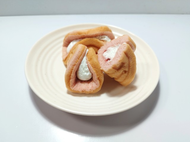 ホイップクリームいちごジャムを使ったワッフルです。以前にくちどけふんわりワッフル(2025年8月19日発売)がありましたが、今回はになっています。そんなくちどけふんわりワッフル苺ですが、ワッフル生地ふんわりとした食感やさしい甘味があって、これだけでも美味しく食べ進められます。ホイップクリームなめらかな食感ミルクの風味で、ワッフル生地との相性抜群です。いちごジャムとろりとした食感いちごの甘味で、味のアクセントになっています。2個入ですが、1個ふた口サイズくらいなので、1人でも普通に食べ切れます。ぜひくちどけふんわりワッフル苺を食べてみてください。