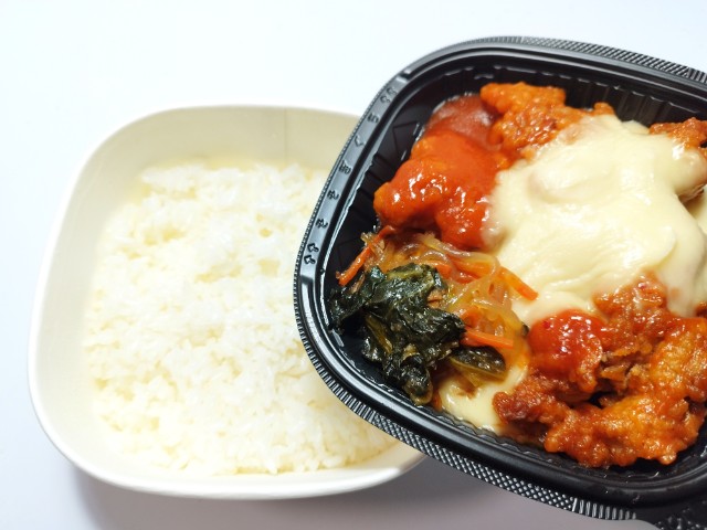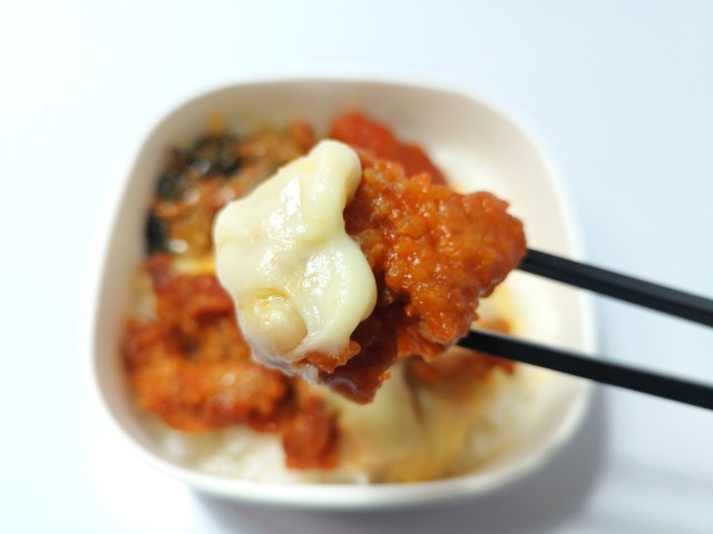 甘辛いヤンニョムチキンと、コク深いチーズソースがたっぷり入った丼ぶりです。