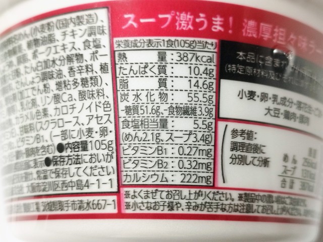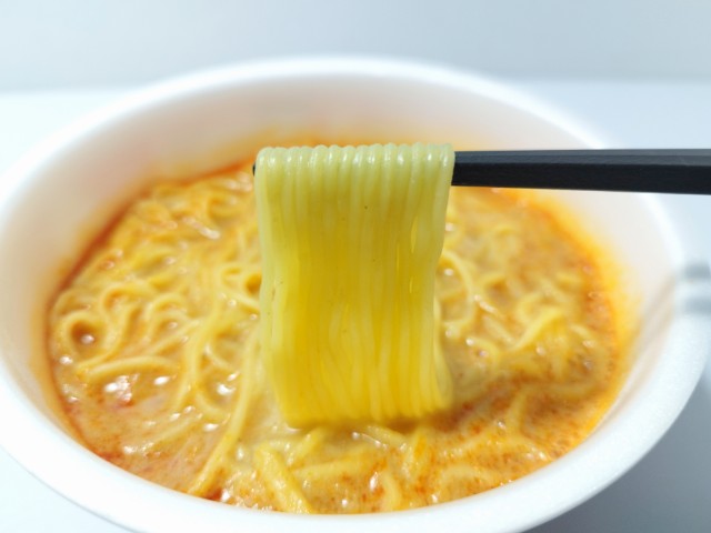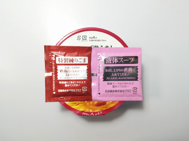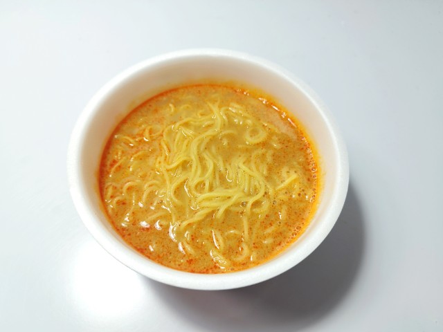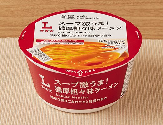 スープが美味しい濃厚担々味ラーメンです。以前にスープ激うま!京都背脂醤油ラーメン(2026年1月13日発売)スープ激うま!濃厚豚骨ラーメン(2025年11月4日発売)などがありましたが、今回は担々味ラーメンになっています。そんな濃厚担々味ラーメンですが、フタを開けると中には特製練りごま液体スープが入っていて、具材はありません。スープ激うまの商品名通り、それだけスープに自信があるという事だと思います。実際に食べてみると、豚の旨味ごまの風味ほどよい辛味があって、クセになってしまう美味しさです。ツルツルとした食感のどごしが良くスープとの相性抜群です。正直、濃厚という言葉が入っていたので、ごまの濃厚な味わいを少し期待していましたが、スープの後味ごまの風味が残るといった感じで、ガッツリとしたごまの味わいというのはありません。ただ、スープ自体が美味しいので、ごまが全面に出ない方が個人的には良いと思います。内容量は普通のカップ麺サイズで、小腹が空いた時おにぎりパンと合わせて1食分にするのにもオススメです。ぜひスープ激うま!濃厚担々味ラーメンを食べてみてください。