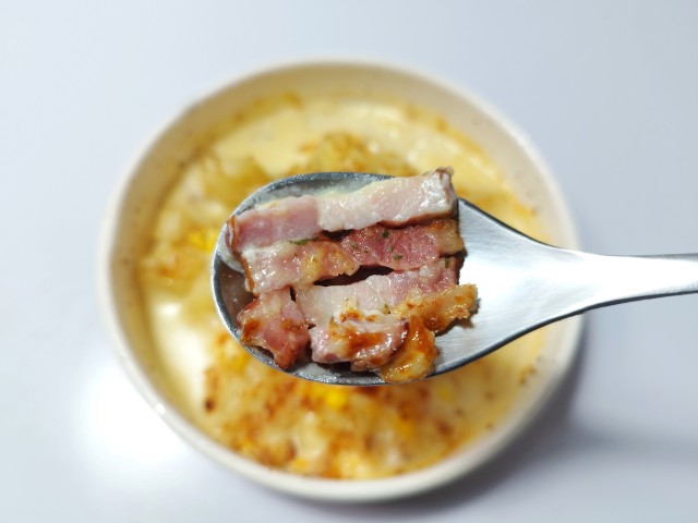 じゃがいもとコーン、ベーコン、マヨネーズを使ったポテトグラタンです。シンプルな見た目ながら、その味が気になって買ってみました。そんなコーンとマヨネーズのポテトグラタンですが、じゃがいもはほくほくとした食感とほのかな甘味があって、安定の美味しさです。ホワイトソースはなめらかな食感とミルクの味わいで、じゃがいもやベーコンともよく合います。マヨネーズの酸味が味のアクセントになっていて、ポテトグラタンの美味しさをさらに引き立てています。出来立ては激熱なので注意が必要ですが、熱い内に食べるのがオススメです。ぜひコーンとマヨネーズのポテトグラタンを食べてみてください。