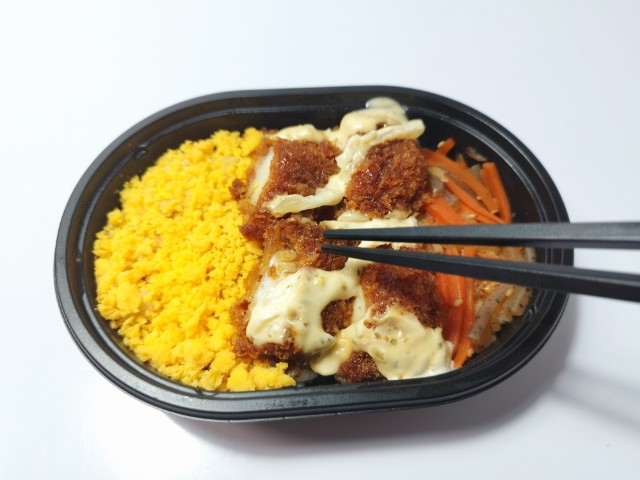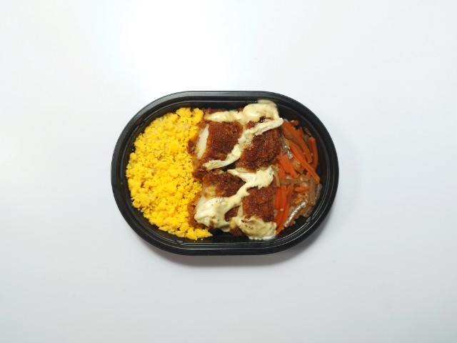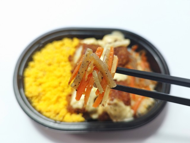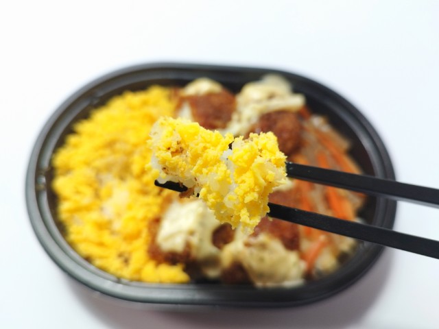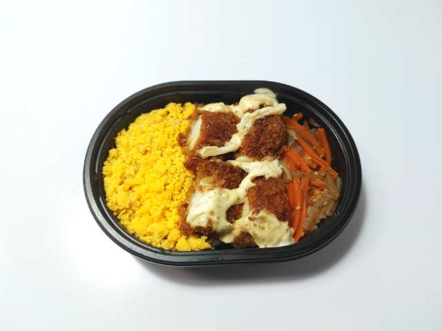 イカフライと玉子そぼろ、きんぴらごぼうがのったお弁当です。彩りの良さに惹かれて買ってみました。そんなイカフライおかか御飯ですが、イカフライは衣に染みたソースのほどよい酸味とイカの柔らかい食感、タルタルソースの旨味があって、ご飯が進む一品になっています。イカフライの他にも玉子そぼろやきんぴらごぼうが入っていて、たまごの甘味やきんぴらごぼうの食感を楽しむ事が出来ます。また、ご飯にはおかかも敷かれているので、最後のひと口まで飽きることなく食べられます。ミニ弁当なので内容量は多くありませんが、小腹が空いた時や軽く済ませたい時などにピッタリです。ぜひイカフライおかか御飯を食べてみてください。