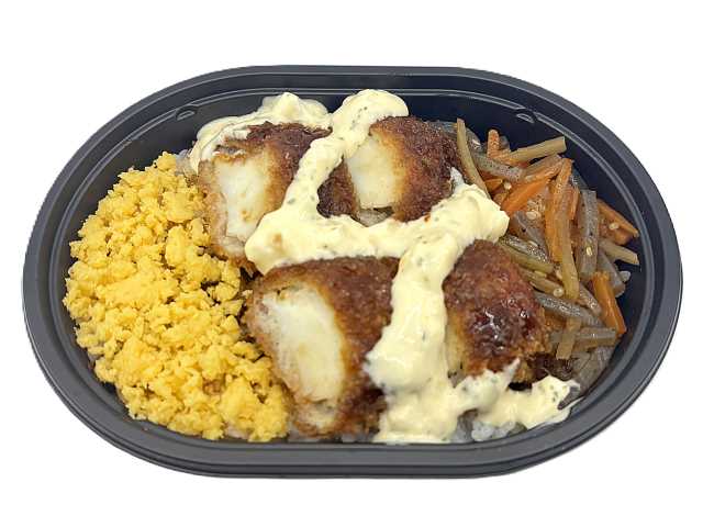 イカフライにタルタルソースをのせ、きんぴらごぼう,玉子そぼろと一緒に盛り合わせた御飯です。