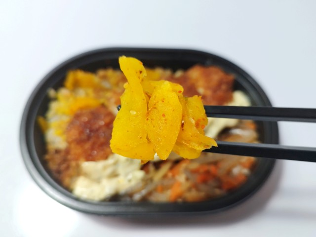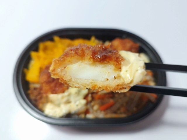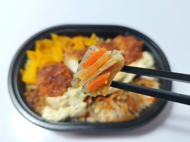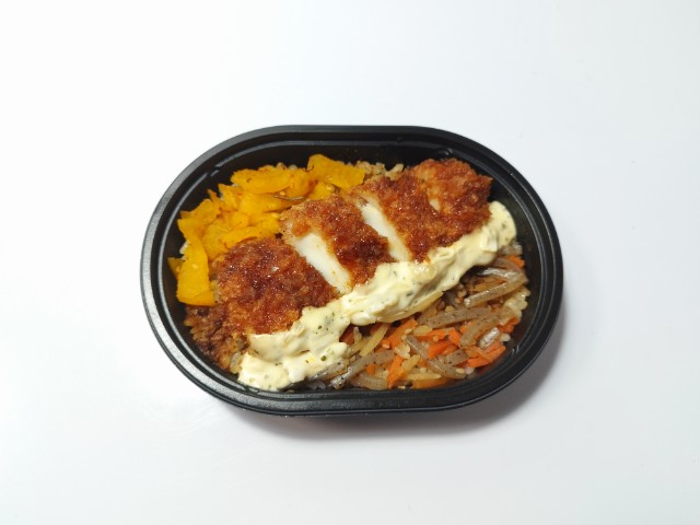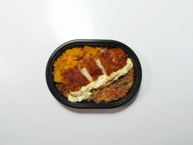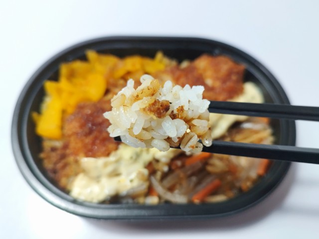 イカフライときんぴらごぼうがのったお弁当です。以前の購入が2026年1月27日発売なので約1ヶ月近く経っていますが、価格は変わっていません。ただ商品名がイカフライおかか御飯からイカフライおかか御飯 (麦飯)に変わっています。そんなイカフライおかか御飯ですが、イカフライは衣に染みたソースのほどよい酸味とイカの柔らかい食感、タルタルソースの旨味があって、ご飯が進む一品になっています。イカフライの他にもきんぴらごぼうや漬物が入っていて、きんぴらごぼうの味わいや漬物の食感を楽しむ事が出来ます。また、今回はご飯が麦ごはんになっていて、プチプチとした食感が良いアクセントになっています。ミニ弁当なので内容量は多くありませんが、小腹が空いた時や軽く済ませたい時などにピッタリです。ぜひイカフライおかか御飯を食べてみてください。