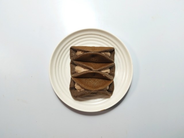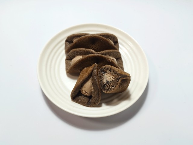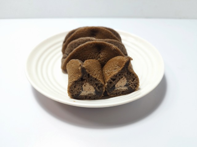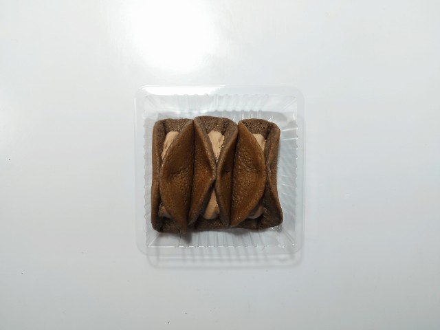 チョコクリームとチョコホイップを挟んだオムレットです。見た目と商品名に惹かれて買ってみました。そんなダブルチョコオムレットですが、生地はしっとりとした食感とココアの風味で、間違いのない美味しさです。中のチョコクリームはなめらかな食感とチョコの味わい、チョコホイップはふんわりとした食感とチョコの甘味で、生地とのバランスも良いです。チョコ尽くしではありますが、くちどけの良さもあって、甘ったるさが残らず食べやすいと思います。3個入ですが、1個はふた口サイズくらいなので、一人でも普通に食べ切れます。ぜひダブルチョコオムレットを食べてみてください。