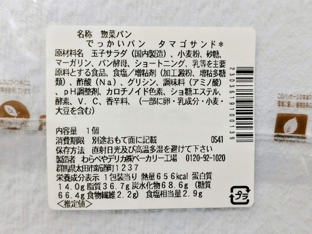 たまごサンドを使った惣菜パンです。でっかいパンという商品名の通り、ベーカリーコーナーでもかなり目立つ存在で、さっそく手に取ってみました。そんなたまごサンドですが、生地ふんわりとした食感歯切れの良さで、安定の美味しさです。たまごサラダたまごの甘味マヨネーズの酸味があって、生地ともよく合います。また、マヨネーズが多く使われている為か、通常のたまごサラダとは違って、なめらかさ酸味がアップしています。大きさは普通の惣菜パンの2倍くらいなので、ガッツリ食べたい方にはピッタリだと思います。ぜひでっかいパンタマゴサンドを食べてみて下さい。