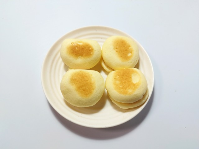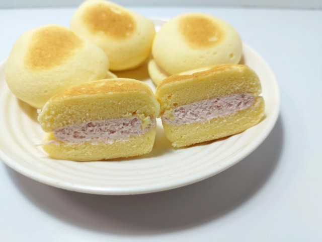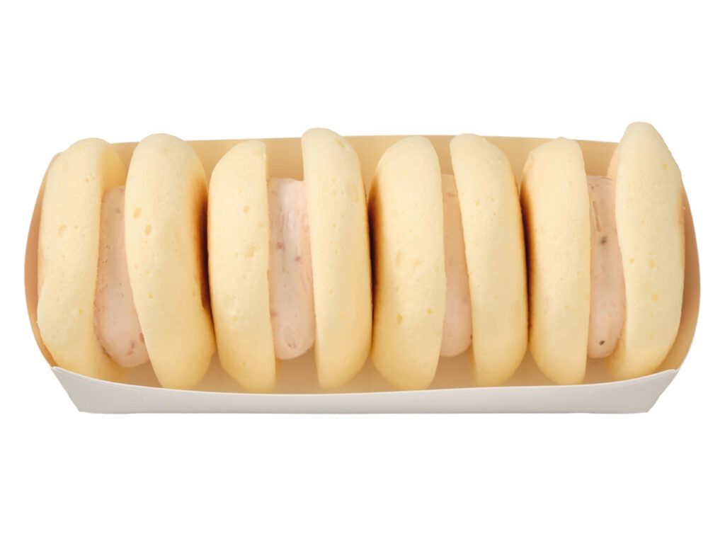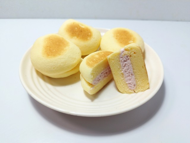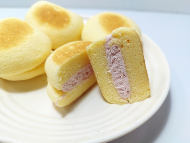 苺レアチーズクリームを挟んだ焼きチーズスフレです。見つけた瞬間に手に取ってしまった商品で、個人的には楽しみにしていた新商品の一つでもあります。そんな焼きチーズスフレですが、生地はふんわりとした食感とチーズの風味、ほのかな甘味があって、これだけでも美味しく食べ進められます。生地の間には苺レアチーズクリームが挟まっていて、なめらかな食感といちごの風味、レアチーズの味わいで、生地との相性抜群です。4個入で1個の大きさは手のひらサイズより少し小さめなので、一人でも食べ切れなくはないですが、シェアするのにピッタリだと思います。ぜひ苺レアチーズクリームの焼きチーズスフレを食べてみてください。