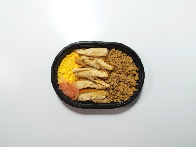 鶏そぼろと鶏の照り焼きのお弁当です。鶏そぼろに鶏の照り焼き、玉子そぼろといった鶏づくしのお弁当になっていて、その見た目と組み合わせに興味をそそられて買ってみました。そんなお弁当ですが、鶏の照り焼きはしっとりとした鶏肉と照り焼きの甘辛い味付けで、ご飯がどんどん進む一品になっています。鶏そぼろは鶏の旨味と醤油の風味、玉子そぼろはたまごの味わいとやさしい甘味で、安定の美味しさです。他にも大根漬がのっていて、こちらは箸休めにちょうどよいです。ミニ弁当なので、内容量はそこまでありませんが、小腹が空いた時や軽く済ませたい時にピッタリだと思います。ぜひ鶏そぼろ&照り焼きのお弁当を食べてみてください。